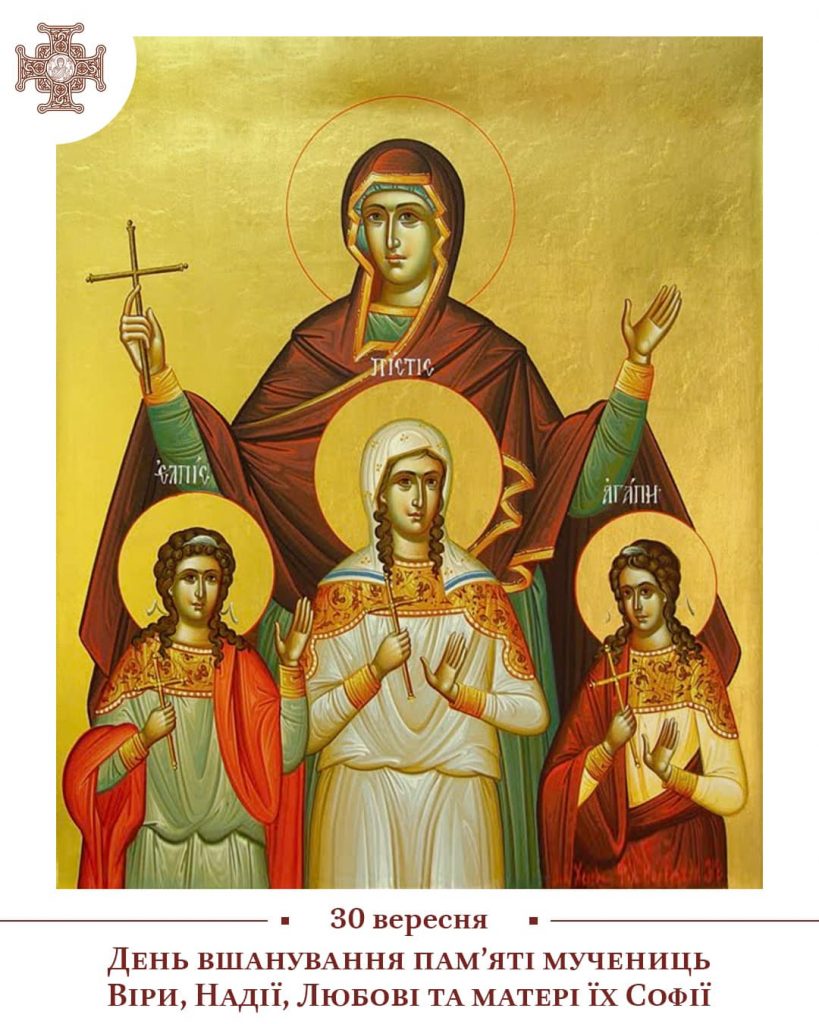 В останній день вересня Церква нагадує нам про найбільші християнські чесноти через вшанування пам’яті святих мучениць Віри, Надії, Любові та матері їхньої Софії. Ці жіночі імена називають три основні чесноти, які народжуються через вищу Мудрість (грец. Σοφία). Вони протягом багато віків залишаються улюбленими в народі, а також окреслюють наші прагнення і бажання – вірити, надіятися, любити.