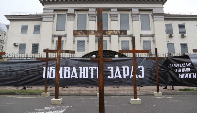 У суботу, 28 листопада, біля будівлі посольства Роcії на Повітрофлотському проспекті в Києві активісти влаштували акцію до Дня пам’яті жертв голодоморів.