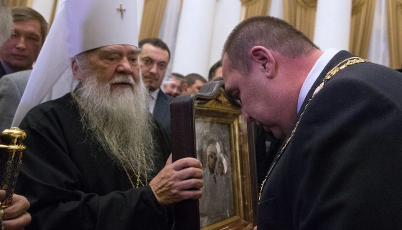 Зліва направо: Іоанникій (Кобзєв), митрополит Луганський і Алчевський РПЦвУ, та Ігор Плотницький, тодішній ватажок угруповання «ЛНР». Окупований Луганськ, 4 листопада 2014 року