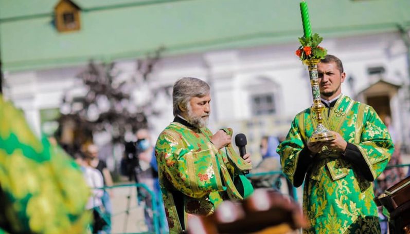 Фото були зроблені на площі Києво-Печерської лаври під час служби на Трійцю, 7 червня, яку очолював лідер РПЦвУ митрополит Онуфрій. На декількох світлинах можна побачити Новинського в облаченні диякона.