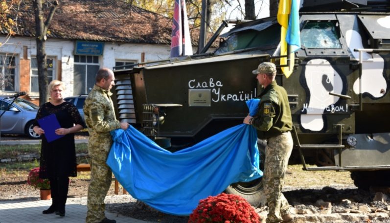 Зазначимо, що пам’ятний знак має доволі оригінальний вигляд – це БТР 58-ї окремої мотопіхотної бригади, яка базується у Сумській області і від 2019 року носить почесну назву на честь Івана Виговського — гетьмана війська Запорозького. Бронемашина розписана білими написами “Слава Україні!”, “Ми разом!” й увінчана прапором України.