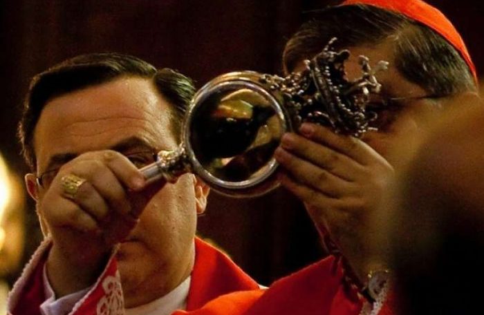 «Коли ми забрали релікварій зі скарбниці, кров була твердою — такою вона і залишилася», — сказав отець Вінченцо де Ґреґоріо, охоронець мощей святого у каплиці святого Януарія катедрального собору Неаполя.