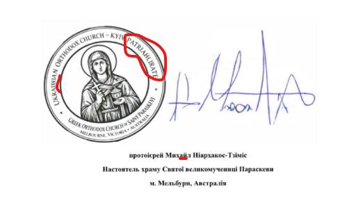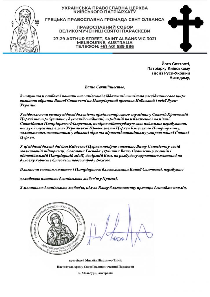 У листі настоятель храму в Мельбурні протоієрей Михайло Ніархакос-Тзіміс “засвідчив щире визнання обрання на Патріарший престол Київський” Никодима.