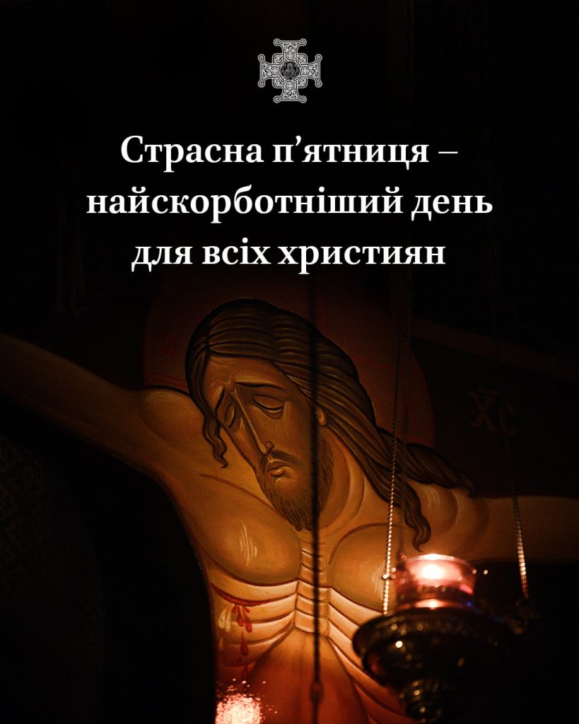 Велика або Страсна п’ятниця – найскорботніший день для всіх православних християн. Ми з великою тугою згадуємо останні години земного життя нашого Спасителя: Його несправедливе осудження, страждання й муки, насмішки над Ним і знущання, розп’яття й смерть. У цей день у храмах не звершується Божественна літургія, а піст є особливо суворим. Про це розповідає Православна Церква України.
