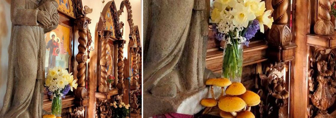 Гриби проросли зі старовинної фігурки Святого Антонія, яка зроблена з каменя-пісковика та стоїть на дерев’яній дубовій підставці.