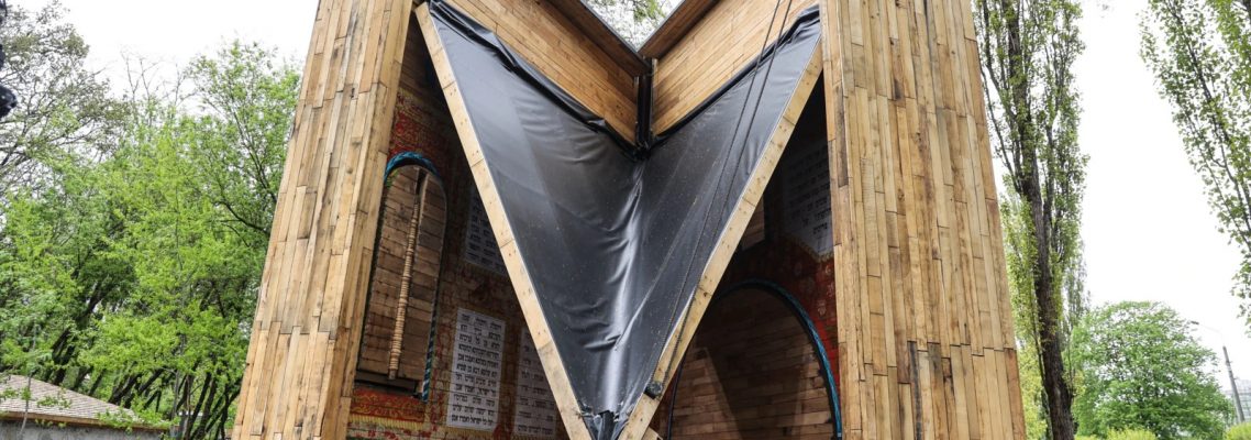 Символічна синагога, яку представили як меморіальний об’єкт «Місце для роздумів», — це 11-метрова дерев’яна споруда у формі книжки, що відкривається та закривається за допомогою спеціальних механізмів.