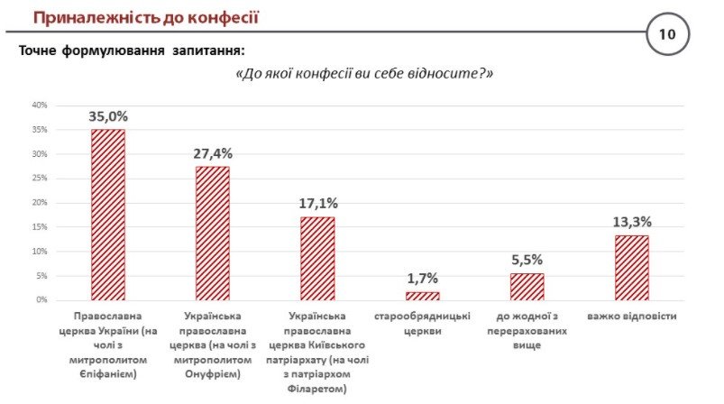 Дослідники запитали, до якої конфесії себе відносять респонденти. З’ясувалось, що прихожанами ПЦУ себе вважають 35% респондентів, ще 27,4% опитаних зізналися, що ходять до УПЦ МП. Крім того, чималий відсоток вірян – 17,1% – відвідують УПЦ Київського патріархату.
