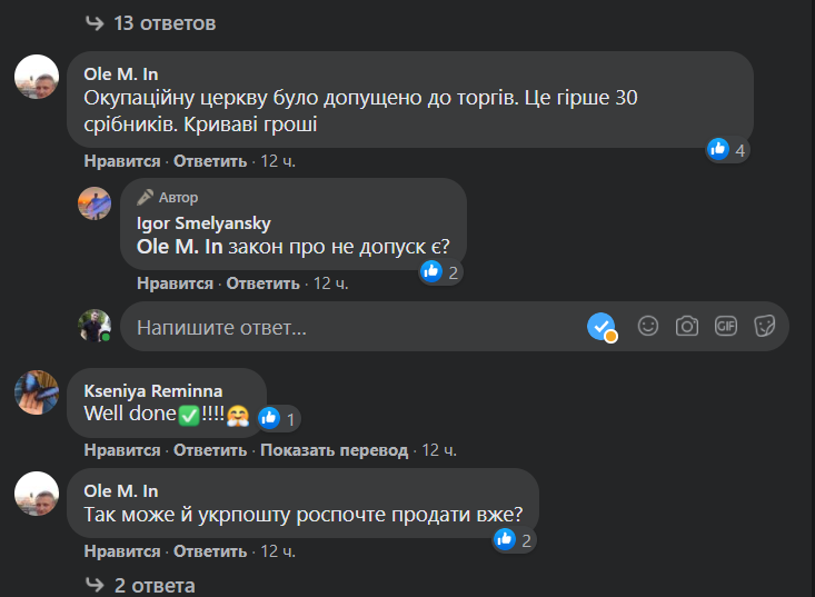 У коментарях до публікації “Укрпошті” дорікають за те, що будівля була продана Церкві Московського Патріархату. Смілянський у відповідь зазначив, що законних підстав для недопуску УПЦ МП до торгів немає. Компанія ніяк не могла вплинути на їхні результати.