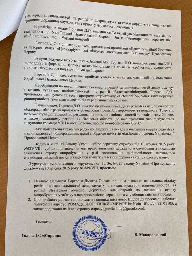 «Перебуваючи на посаді начальника відділу релігій і національностей Департаменту з питань культури, національностей та релігій облдержадміністрації, Горєвий Д. О. продовжує записувати і вести програми ютуб-каналу DetectorUA, зміст яких порушує рівноправність громадян в залежності від їхніх релігійних переконань», — йдеться у документі пропагандистів РПЦ в Україні.