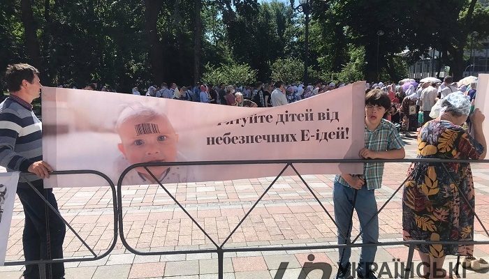 Мітингувальники тримають у руках плакати з написами: “Вимагаємо видачі паперового паспорта – без суду!”, “У смартфоні держава – це людина без імені і права?”, “Народ України проти: УНЗР, ID паспортів, “Е-Малятко”, “Україна у смартфоні”, “Рятуйте дітей від небезпечних Е-ідей”, “Електронний дублікат громадянина – 3D образ від звіра (Одкровення 15:2) – позбавляє “біологічного” громадянина всіх прав”.
