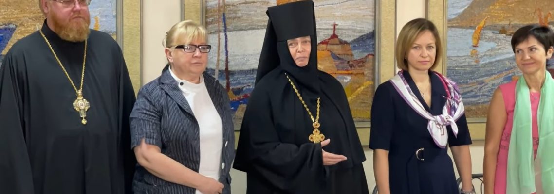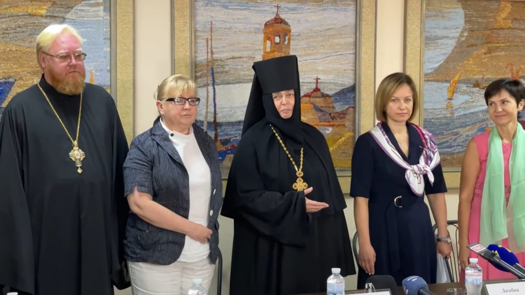 Ігуменю Серафиму видно і на фотографіях із сайту міністерства, і на відео представництва Московського Патріархату. На урочистому відкритті вона стоїть поруч із міністеркою Лазебною.