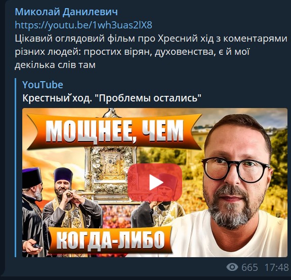 «Цікавий оглядовий фільм про Хресний хід з коментарями різних людей: простих вірян, духовенства, є й мої декілька слів там», — написав речник РПЦвУ.