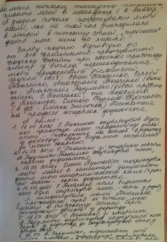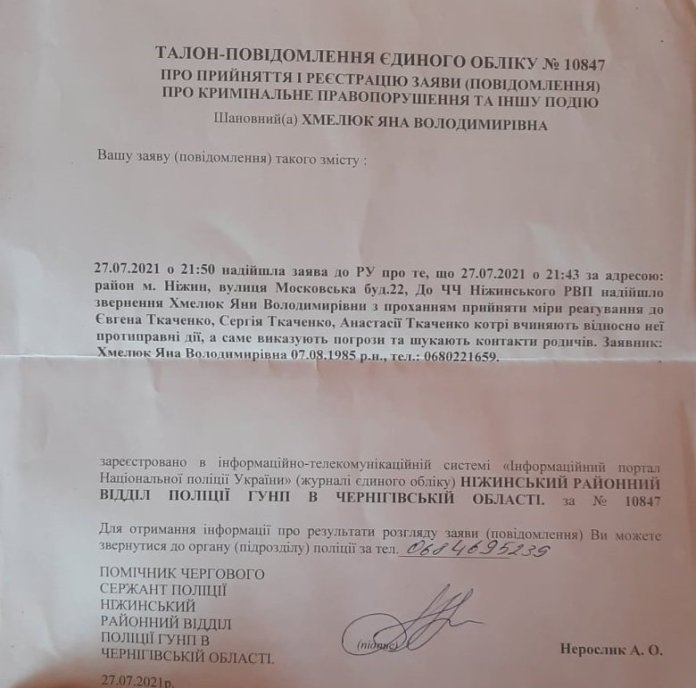 Ніжинський районний відділ поліції зареєстрував повідомлення про кримінальне правопорушення з проханням вжити заходів реагування на погрози й кібербулінг з боку Євгена Ткаченка, Сергія Ткаченка, Анастасії Ткаченко (Разумейко) й Олени Фурси (Пустовіт).