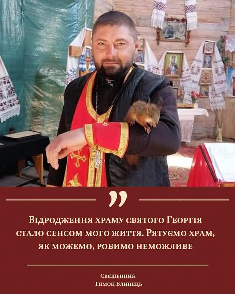 Через аварійний стан церкви в настоятеля з’явився маленький співмешканець. Білченя Степан, яке випало з материнського гнізда в стіні Георгіївського храму, вже більше року живе вдома в отця Тимона, ставши немовби членом родини для священника та його сина.