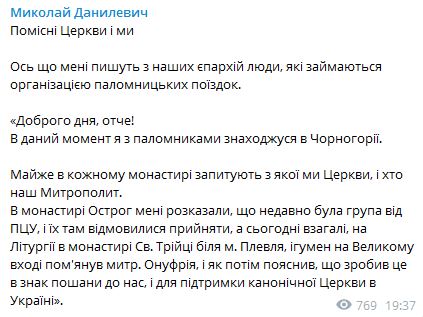 «Доброго дня, отче! В даний момент я з паломниками знаходжуся в Чорногорії. Майже в кожному монастирі запитують з якої ми Церкви, і хто наш митрополит. В монастирі Острог мені розказали, що недавно була група від ПЦУ, і їх там відмовилися прийняти, а сьогодні взагалі, на літургії в монастирі Св. Трійці біля м. Плевля, ігумен на Великому вході пом’янув митр. Онуфрія, і як потім пояснив, що зробив це в знак пошани до нас, і для підтримки канонічної Церкви в Україні», – зацитував Данилевич.