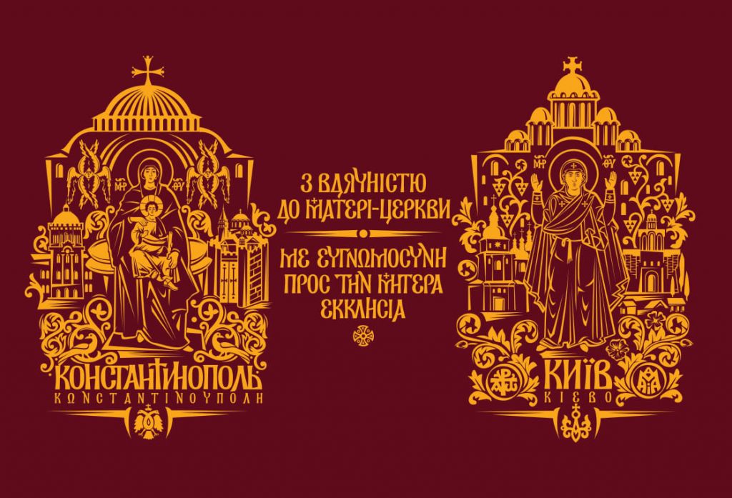 “Я вибрав головними символами Софію Константинопольську і Софію Київську з образами Богоматері, які находяться в цих храмах. Додатковими символами стали резиденції Церков – Фанар (Велика школа, Ζωγράφειον Λύκειον) та Михайлівський собор. Щоб підкреслити ідею топографії міста я вибрав ворота Феодосія з образом Константинополя (пряма цитата з мозаїки в Софії) й Золоті ворота в Києві. В орнаменті Царгорода можна побачити візантійські образи й сюжети. Зверху зображені херувими, взяті з купола Софії Константинопольської + герб Візантії внизу.