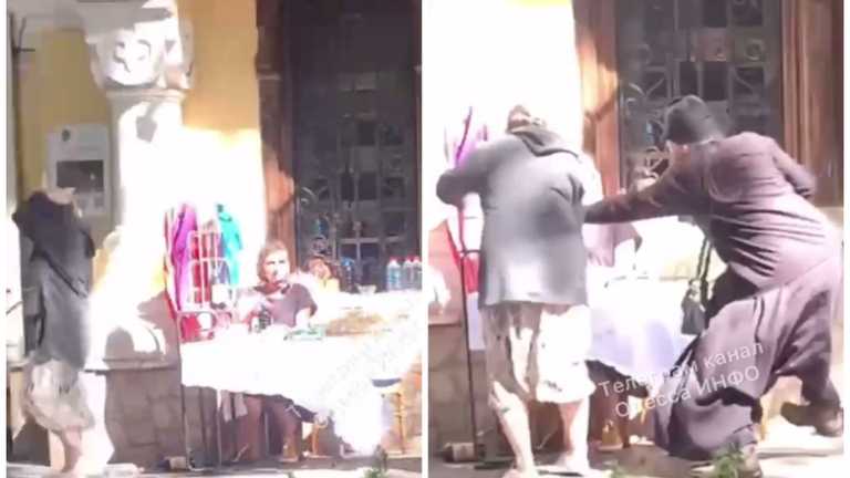 На записі видно, як чернець сильно штовхає жінку та вона швидко йде геть. Потім до нього підходить сестриця та старається заспокоїти монаха. Чернець натомість кричить до неї, що жінка вино хотіла “старабанити”.