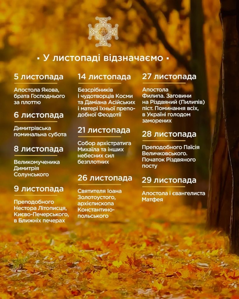 Також вшановуватимемо пам’ять безсрібників і чудотворців Косми та Даміана (14 листопада), в той же день молитимемося і за всіх дітей-сиріт (друга неділя листопада). 21 числа відзначатимемо Собор архістратига Божого Михаїла та інших небесних сил безплотних, а також знаменне для українського народу державне свято – День Гідності та Свободи.