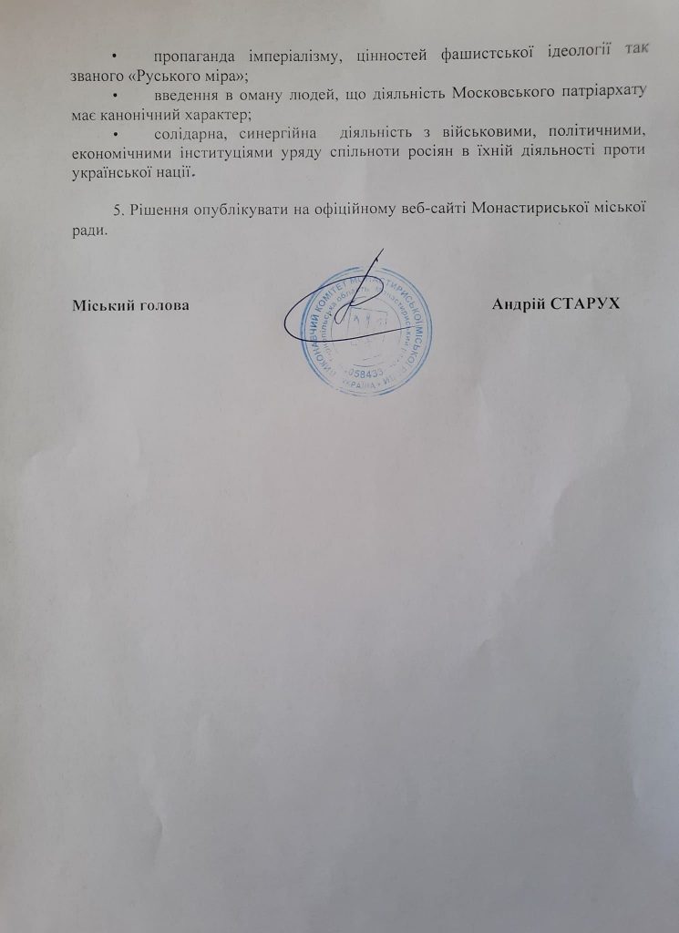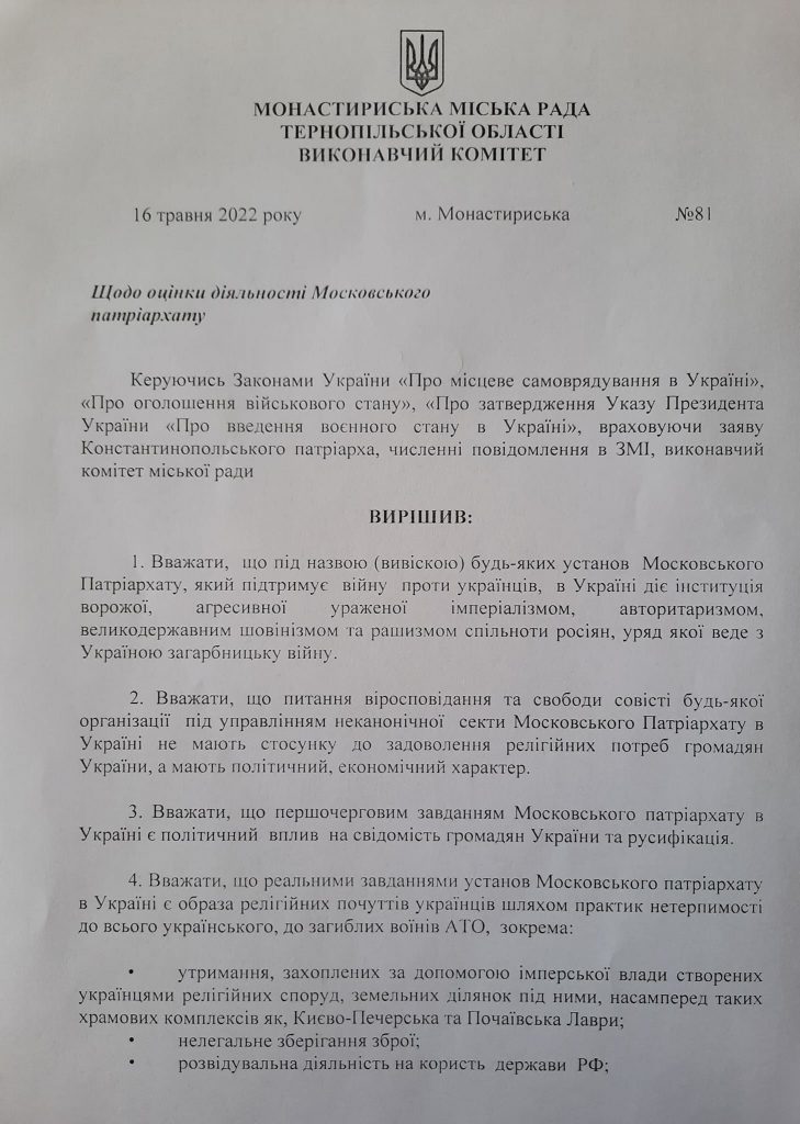 В Монастириську Тернопільської області Московський патріархат визнали ворожою інституцією. Зазначається, що таким чином місцеве самоврядування висловило свою позицію щодо діяльності Московського патріархату.