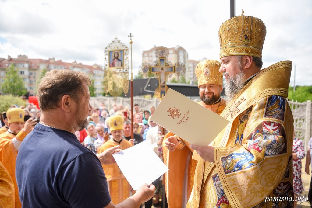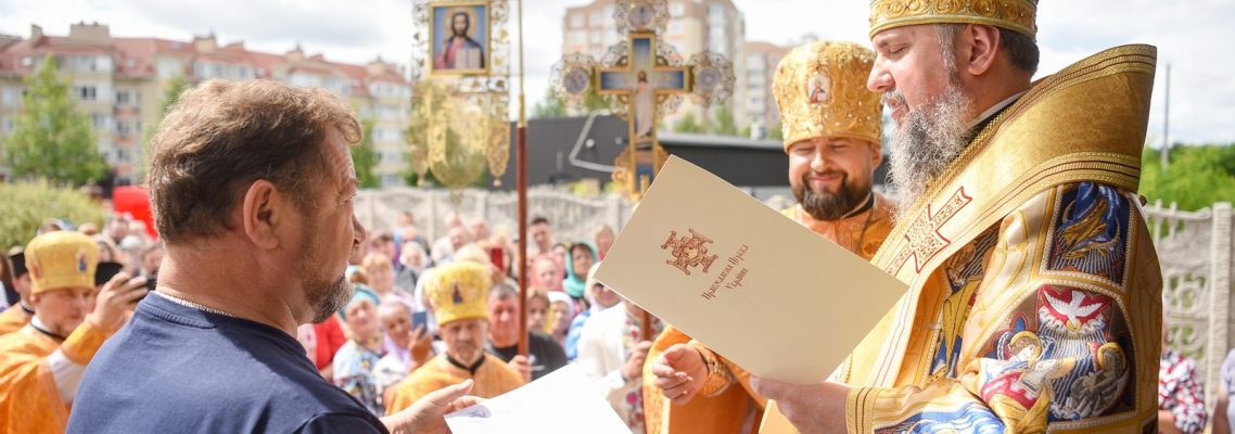 Окрім того, після урочистого хресного ходу Предстоятель відзначив благодійників церковними нагородами та привітав представників десяти громад Київщини, які послідували Томосу і нещодавно долучилися до родини ПЦУ, вручивши їм відповідні Укази.