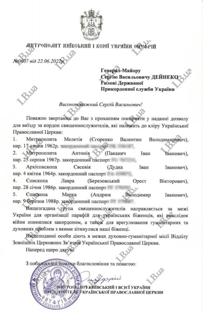 Зокрема, глава УПЦ МП просить дозволити виїзд керуючому справами УПЦ митрополиту Бориспільському і Броварському Антонію (Паканичу), одному з найбільш проросійських діячів УПЦ МП.
