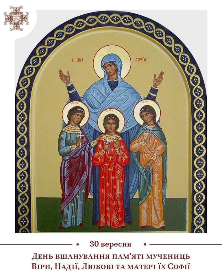 Сьогоді вшановують пам’ять святих мучениць Віри, Надії, Любові та їхньої матері Софії.