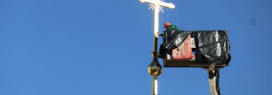 Фахівці розпочали з повернення на купол Трапезної церкви хреста, повідомляє Kyiv-independent.