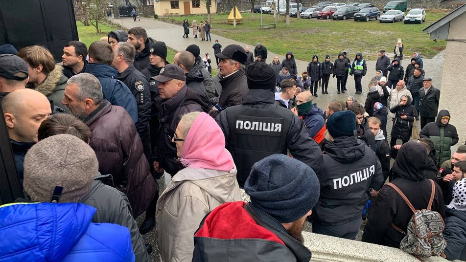 Одразу ж поліцейські вивели людей з церкви на вулицю. Дискусія вже продовжилися надворі. За підрахунками працівників поліції, на мітинг вийшли майже 70 осіб.
