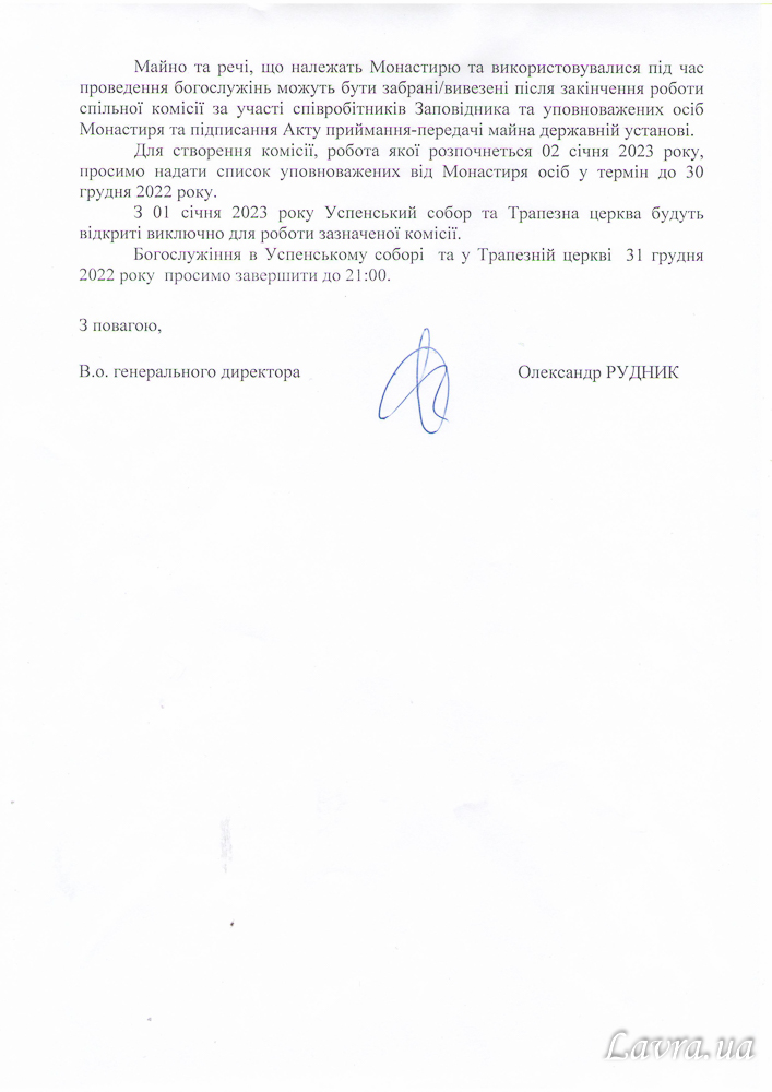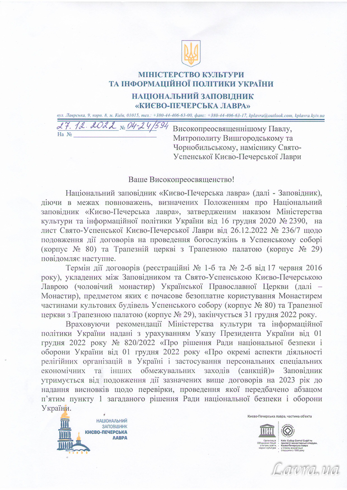 У листі йдеться, що термін дії договорів (реєстраційні № 1-б та № 2-б від 17 червня 2016 року), укладених між Заповідником та Свято-Успенською Києво-Печерською Лаврою (чоловічий монастир) Української Православної Церкви, предметом яких є почасове безоплатне користування монастирем частинами культових будівель Успенського собору (корпус № 80) та Трапезної церкви з Трапезною палатою (корпус № 29), закінчується 31 грудня 2022 року.