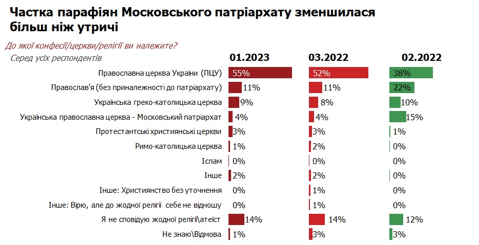 Упродовж року частка прихильників УПЦ Московського Патріархату скоротилася з 15% у лютому 2022 року до 4% у січні 2023 року.