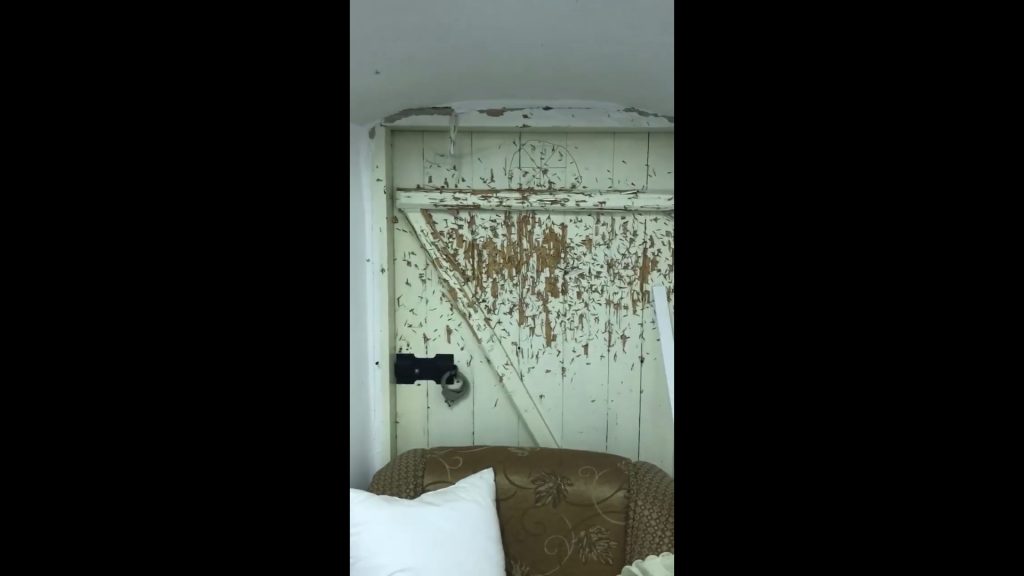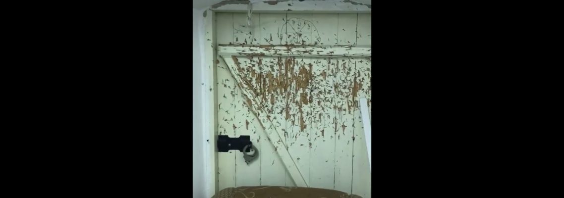 На опублікованому Мінкультом відео видно, що старі дерев’яні двері понівечені так, ніби вони тривалий час були мішенню для метання ножів.