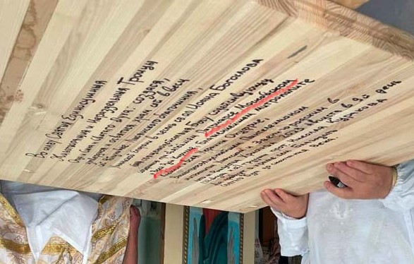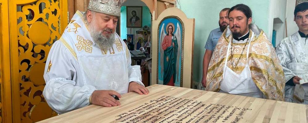 Новоосвячений престол у одному з храмів Лисянщини. Титулярний митрополит в Умані Пантелеімон перевіряє до підпису зворотню сторону стільниці, на якій чорним по білому рукою місцевого духовенства написано “Во славу Святыя Единосущныя Нераздельныя Троицы Отца, и Сына, и Святаго Духа: создася, утвердися и осятися храм сей в веси сей Яблунивке, Лисянского благочиния, Уманской епархии в честь св. ап. Иоанна Богослова, священнодействия Богу содействующу при Святейшем Патриархе Московском и всея Руси Кирилле, Блаженнейшем Митрополите Киевстем и всея Украины Онуфрие, Высокопреосвященнейшем Пантелеимоне, митрополите Уманском и Звенегородском, в лето от Рождества Христова 2023 августа в 9 день. Да пребудет в храме сем Благодать Святаго Духа до скончания века».