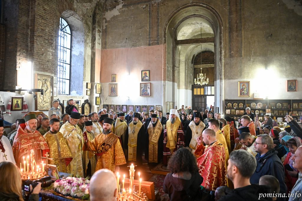 У храмі, який зазнав пошкоджень від російських обстрілів, Митрополиту Епіфанію співслужили митрополит Сімферопольський і Кримський Климент, архієпископ Дніпровський і Січеславський Симеон, архієпископ Харківський і Слобожанський Митрофан, настоятель храму протоієрей Віктор Маринчак та місцеве духовенство.