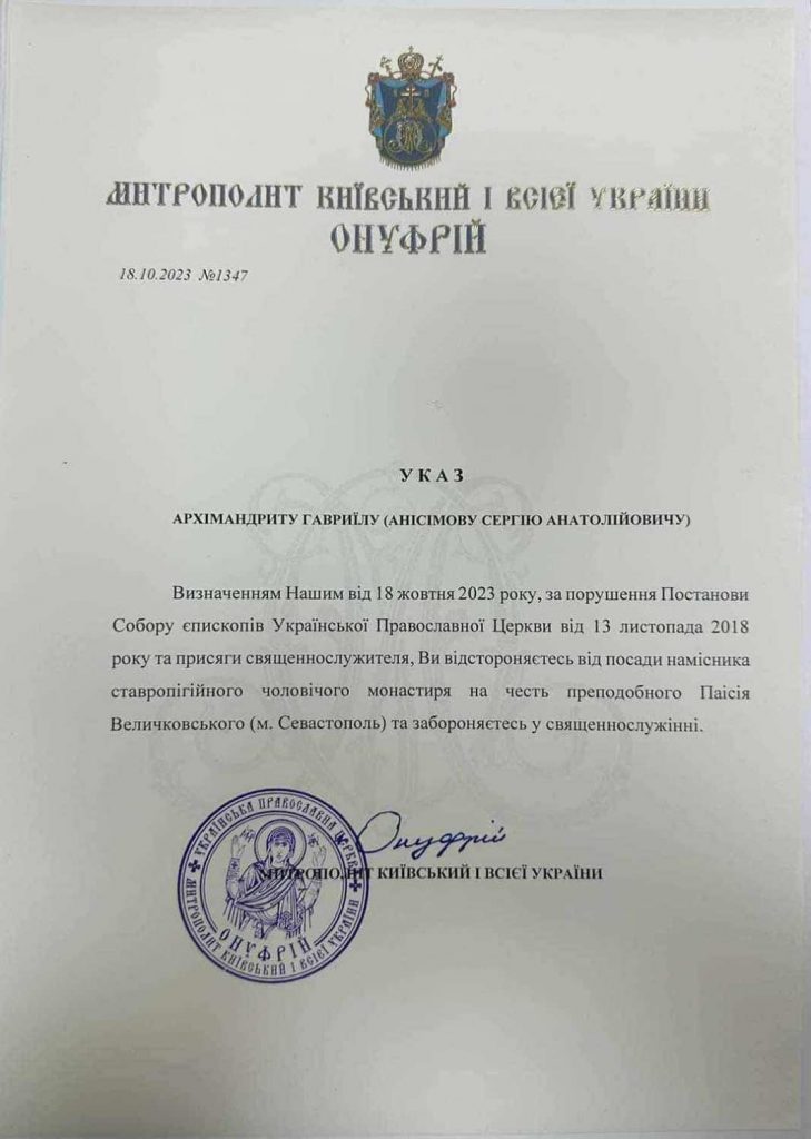 Очільник УПЦ МП Онуфрій (Березовський) відсторонив від посади намісника ставропігійного чоловічого монастиря Паісія Величковського, що у Сімферополі, та заборонив священнослужіння архімандриту Гавриїлу (Анисимову).