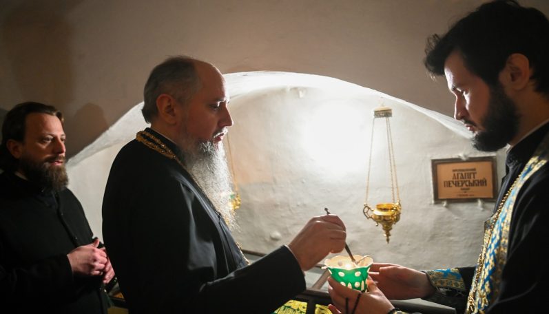 По завершенню відправи Предстоятель Православної Церкви України звернувся до присутніх зі словом, вклонився у печерах перед святими мощами преподобних отців Печерських та помазав присутніх освяченим єлеєм.